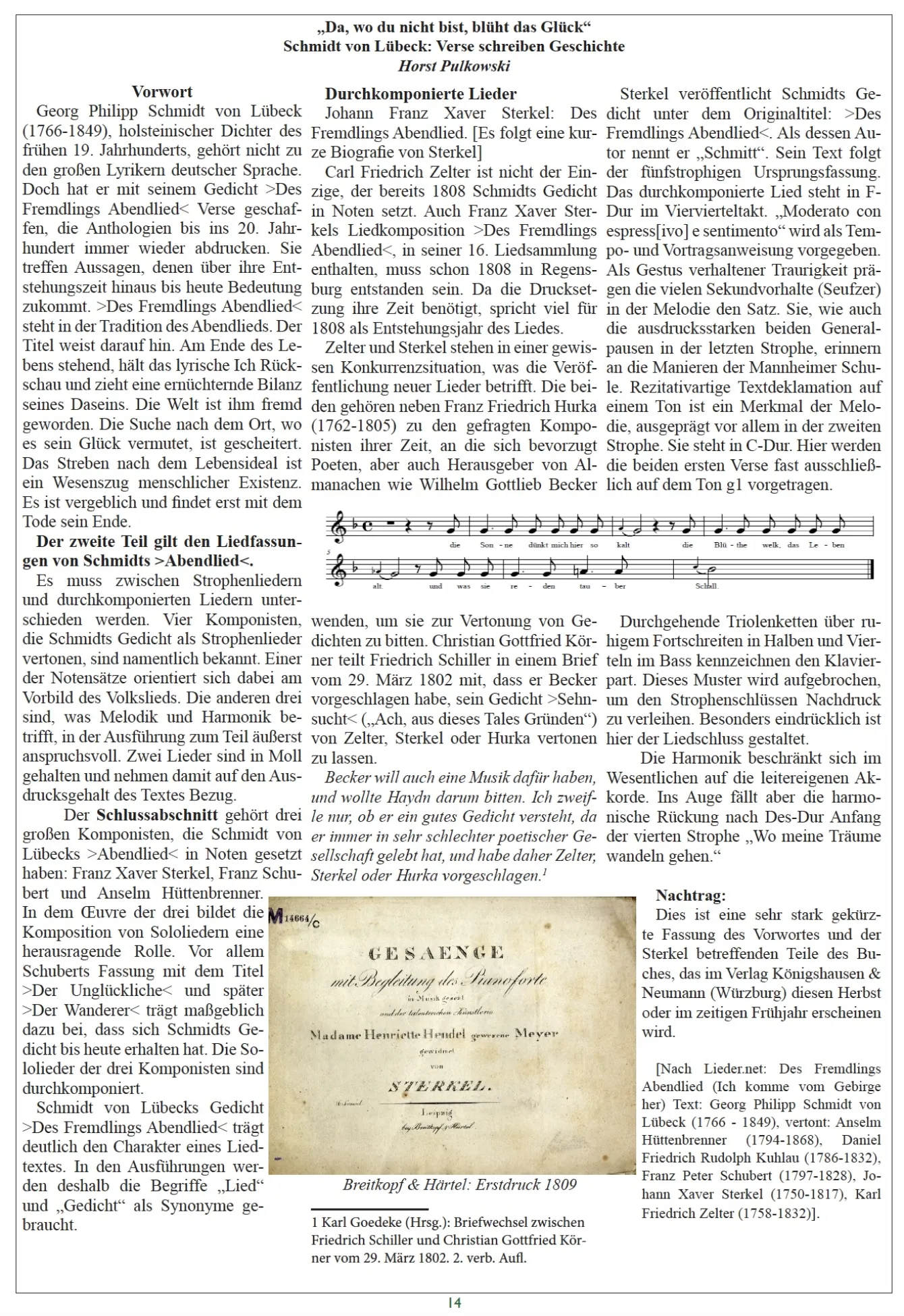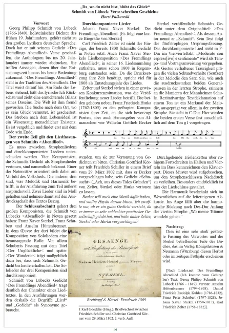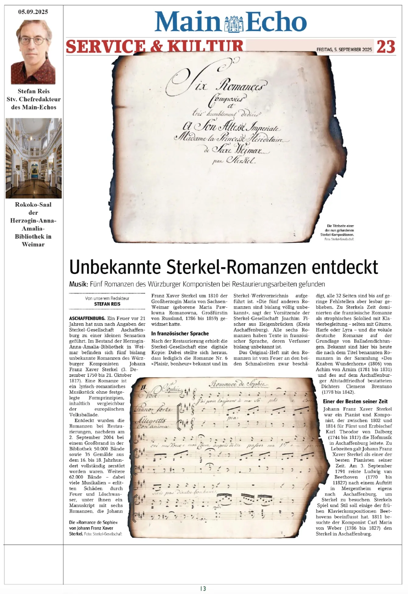 Der fürchterliche Brand der Herzogin-Anna-Amalia-Bibliothek am 2. September 2004, also vor genau 21 Jahren, hat 50.000 Bände sowie 35 Gemälde aus dem 16. bis 18. Jahrhundert vollständig zerstört, rund 62.000 Bände, darunter auch viele Musikalien, wurden durch Feuer und Löschwasser zum Teil stark beschädigt. Doch schon kurze Zeit danach wurde mit der Restaurierung begonnen und in den letzten Tagen wurde ein Manuskript mit sechs Romanzen von Johann Franz Xaver Sterkel aufwändig restauriert und eine digitale Kopie der Sterkel-Gesellschaft übersandt, der es gelang, mit Hinweis auf das Alter des Vorstandes die Restaurierung etwas vorzuziehen. Stünde Mozart und nicht Sterkel auf der ersten Seite wäre das eine Weltsensation, doch so ist es für uns eine sehr große und überaus freudige Überraschung. Von diesen sechs Romanzen, die als Manuskript von Sterkel etwa 1810 der Großherzogin Maria von Sachsen-Weimar, geb. Maria Pawlowna Romanowna, Großfürstin von Russland (* 1786, † 1859) gewidmet wurden, ist nur die Nr. 6 „Plaisir, bonheur“ bekannt und im Sterkel-Werkverzeichnis aufgeführt. Die fünf anderen Romanzen sind bislang völlig unbekannt! Alle sechs Romanzen haben Texte in französischer Sprache, deren Poet bisher noch unbekannt ist. Eine Basiskonservierung erfolgte 2016, die musikwissenschaftliche Bewertung damals: herausragende Bedeutung und die Empfehlung: Originalerhaltung empfohlen. Das Heft wurde von den Flammen an den beiden Schmalseiten geschädigt, doch der Feuerteufel war offensichtlich ein Sterkel-Freund und alle 32 Seiten sind bis auf ganz geringe Fehlstellen lesbar geblieben. Die Restauratoren der HAAB haben auch mit diesem Werk eine hervorragende und bewunderungswerte Arbeit geleistet und wertvolles Kulturgut gerettet.