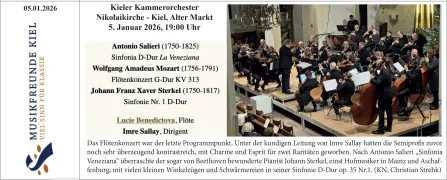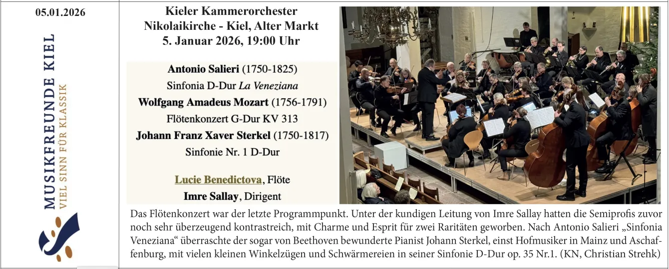 Orchesterkonzert: 19 Uhr, Nikolaikirche Kiel, Alter Markt. Die 2007 in Witten geborene Flötistin Lucie Benediktová ist ein Phänomen. Ausgebildet in Kiel bei Gesa Wecker und inzwischen in der Frühförderung der Hochschule für Musik und Theater in Rostock hat schon mehrere Erste Bundespreise beim Wettbewerb Jugend musiziert gewonnen und ist Mitglied im Bundesjugendorchester! Im Mozart-Konzert der Musikfreunde spielt die Stipendiatin der Deutschen Stiftung Musikleben das bekannteste Flötenkonzert von Mozart, das in G-Dur. Ansonsten bietet das Kieler Kammerorchester unter der Leitung von Imre Sallay zwei klassisch-sinfonische Raritäten. Mit Antonio Salieris Sinfonia La Veneziana gibt es einen Beitrag zum Hafenstadt-Schwerpunkt der Saison. Außerdem bietet das KKO noch eine hochklassische Sinfonie von Johann Franz Xaver Sterkel. Das virtuose Spiel diese legendären Pianisten Sterkel beeindruckte sogar Beethoven. Der Italien-erfahrene Komponist wirkte in Mainz, Aschaffenburg und seiner Geburtsstadt Würzburg.